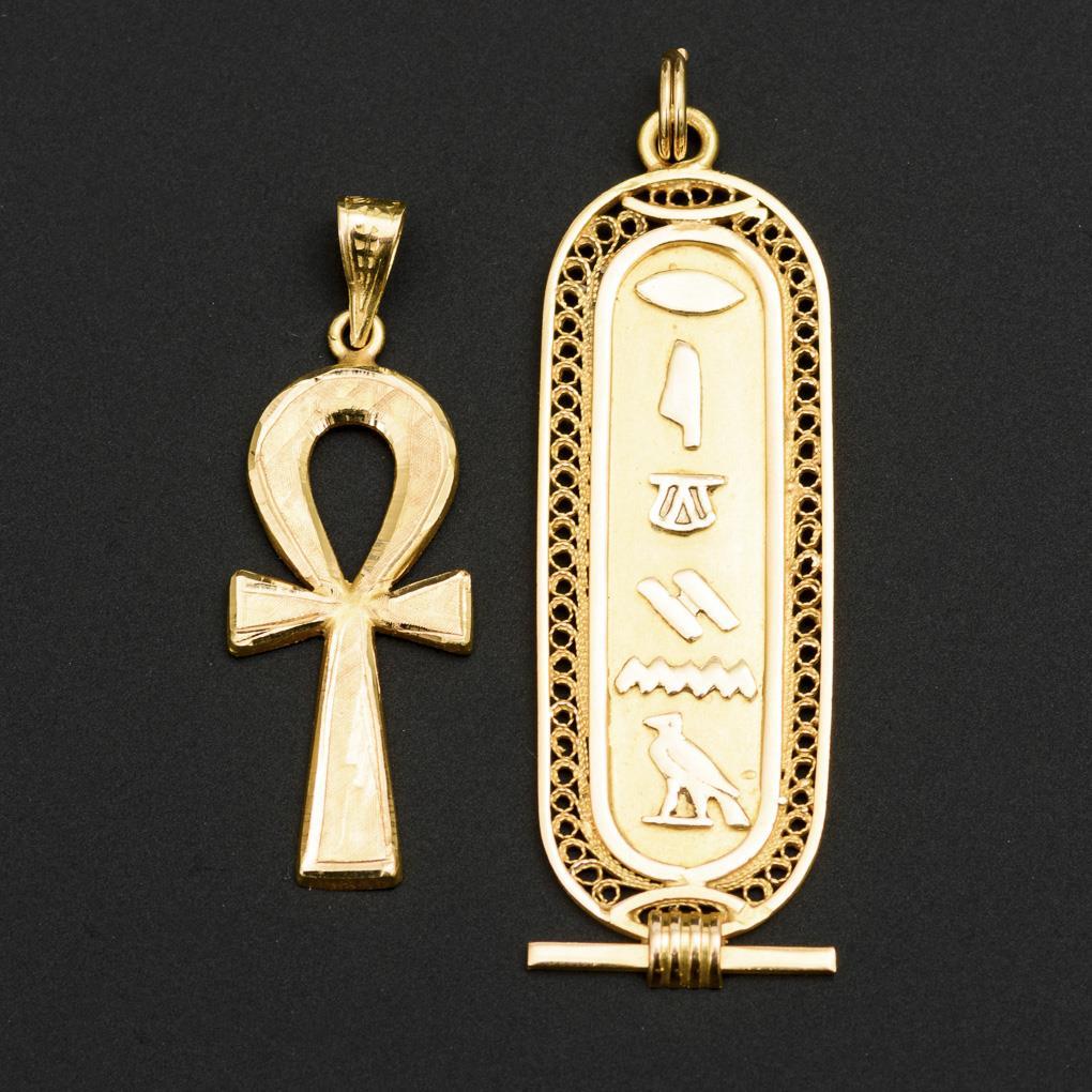 Anhänger mit reliefierten Hieroglyphen und Ankh-Kreuzanhänger.