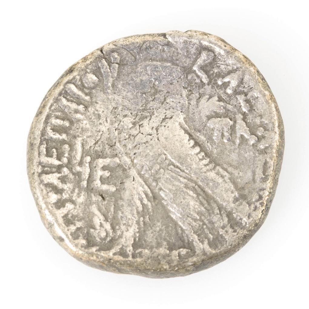 Kopf des Ptolomaios XII mit Ägis und Diadem; Adler mit Palmzweig über der Schulter, nach links auf Blitz stehend. Zustand: schön.