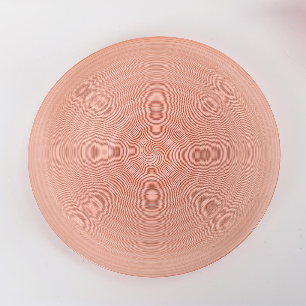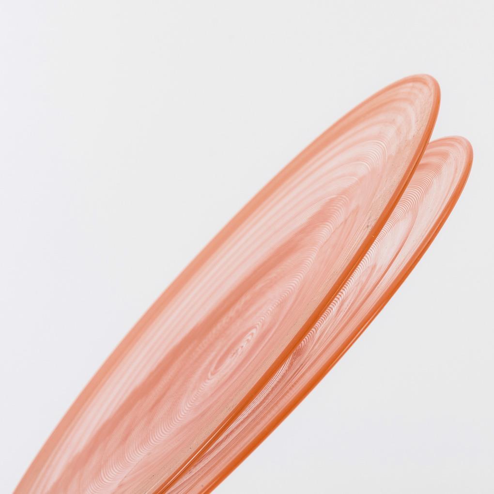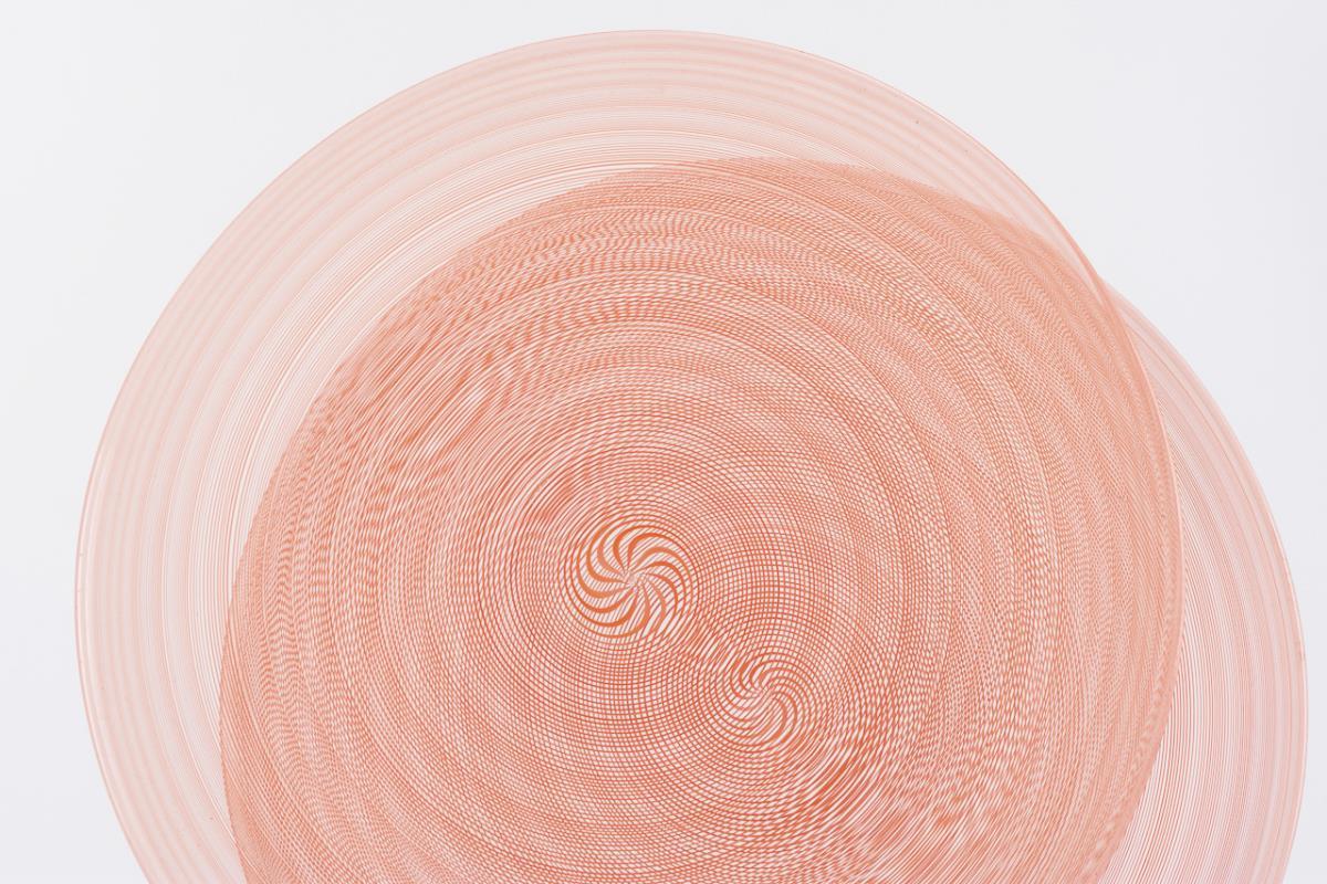 Farbloses, feuerfestes und vor der Lampe geblasenes Glas mit eingeschmolzenen roten, spiralig verdrehten Glasfäden.