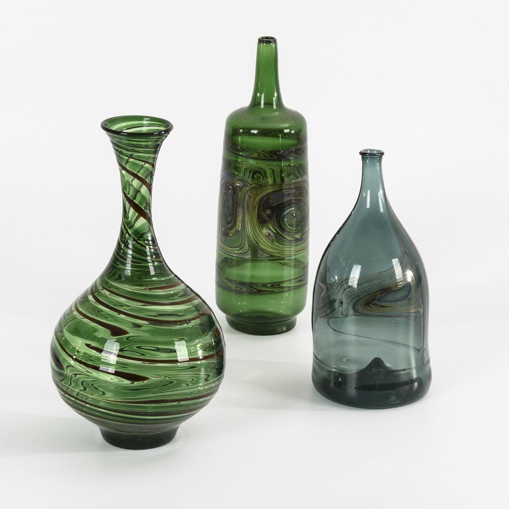 1x Kugelbauchvase mit Enghals: aus spiralig montiertem grünen und farblosen Glas mit rotem Faden. / 1x Zylindervase aus grünem Glas mit eingeschmolzenem roten, gekämmten Faden. / 1x Flasche aus petrolfarbenem Glas.
