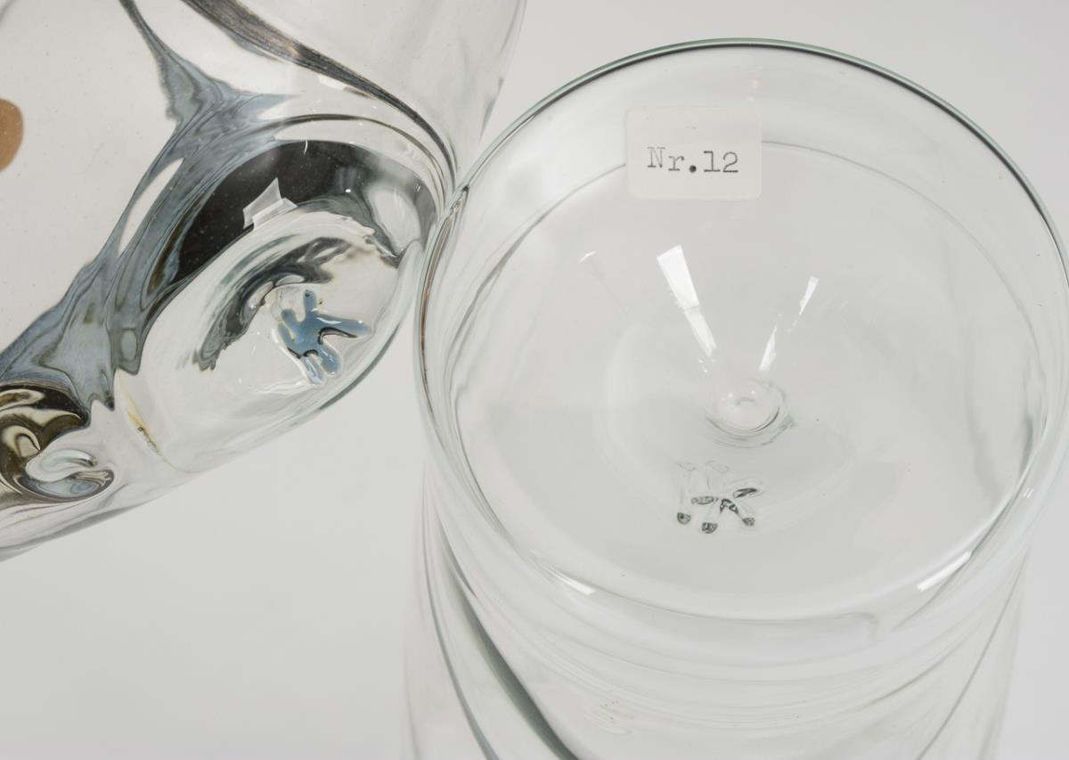 Farbloses und petrolfarbenes Glas, montiert, vor der Lampe geblasen, schwarz-braunes, gemasertes Emaildekor. H 13,5 und 26 cm.