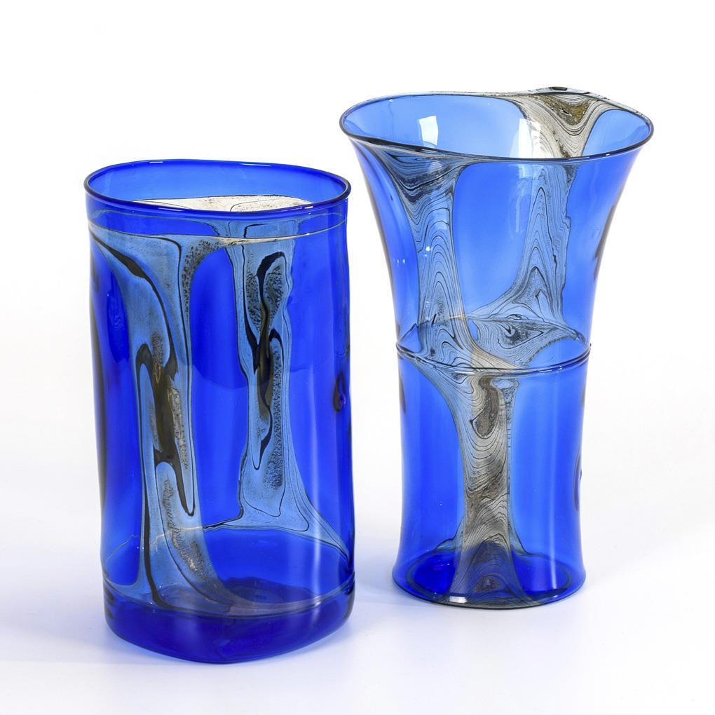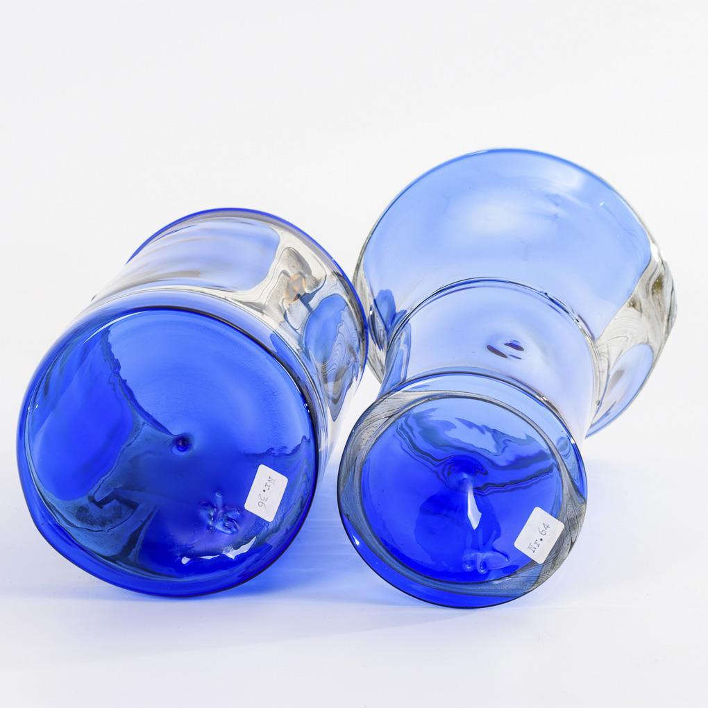 Montiertes und vor der Lampe geblasenes, farbloses und kobaltblaues Glas, mit rauchfarbenem, gemasertem Emaildekor. H 21,5 und 23 cm.