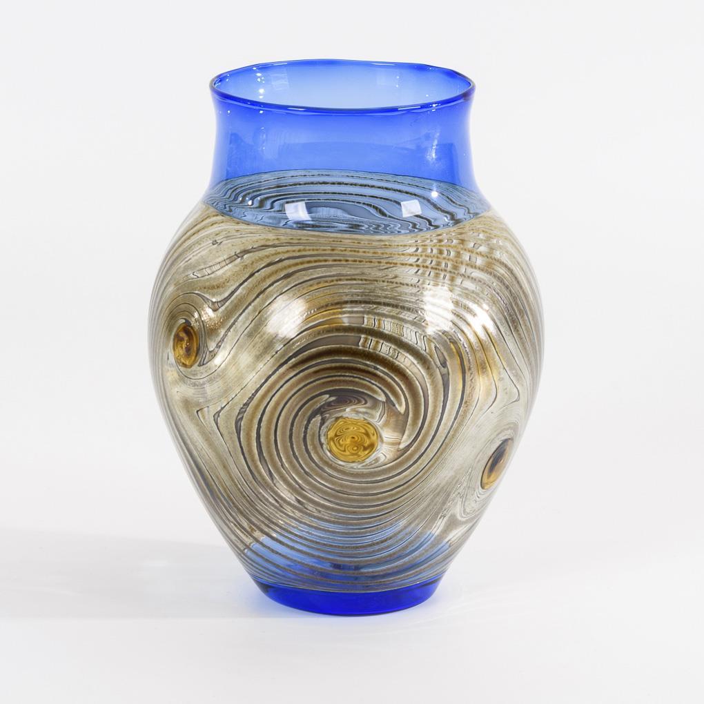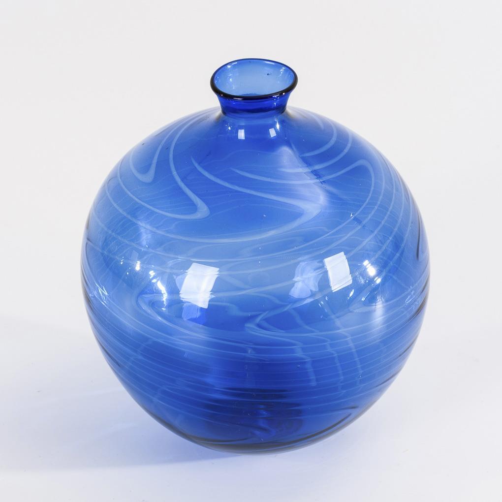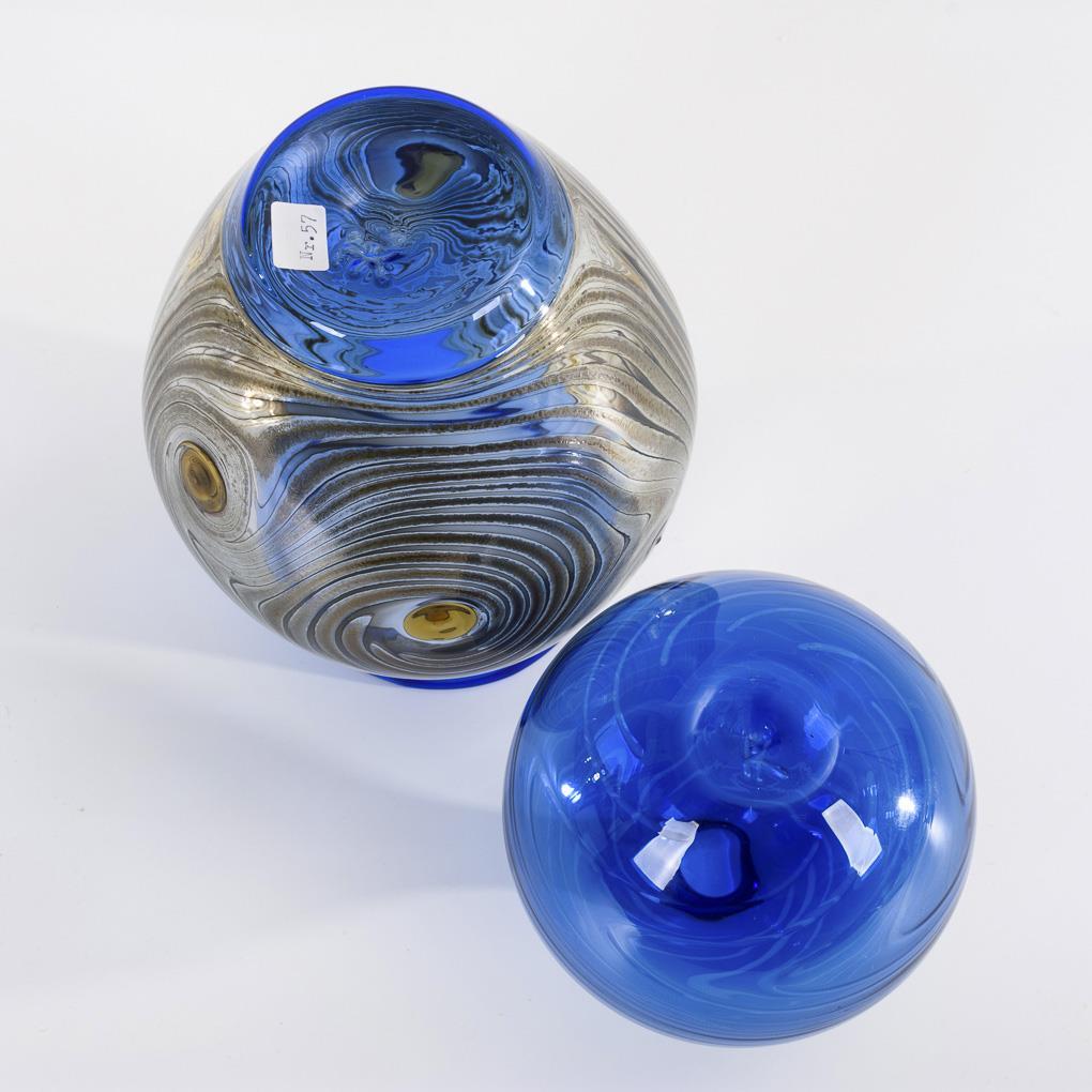 Farbloses und kobaltblaues, lampengeblasenes Glas. 1x montiert, mit eingeschmolzenen, bernsteinfarbenen Tropfen und aufgeschmolzener, wellenartig verzogener schwarzer Emailfarbe. H 15 und 21 cm.