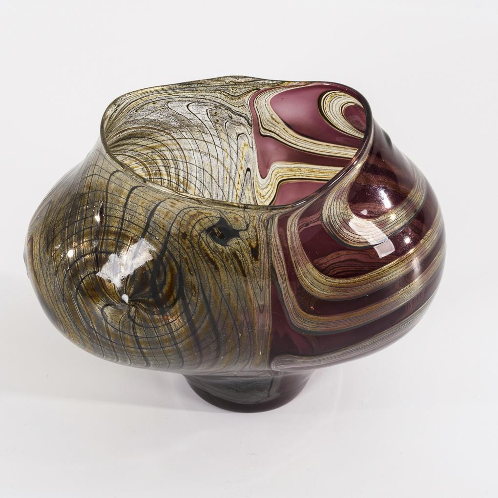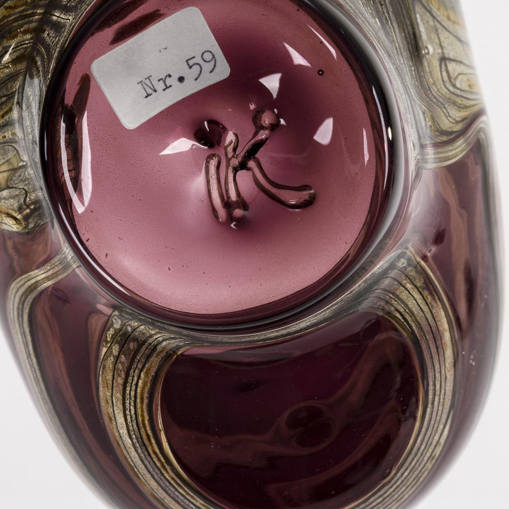Farbloses und violettes Glas, montiert, vor der Lampe geblasen, schwarz-braunes, spiralig gemustertes Emaildekor. H 14 cm.