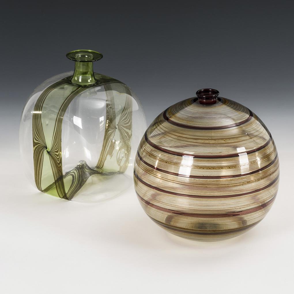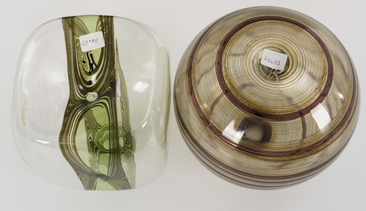 1x Vase in Form einer Vierkantflasche aus farblosem Glas mit grünem Glasstreifen. / 1x Kugelvase aus farblosem Glas und violetten, horizontal angeordneten Glasbändern sowie streifigem Emaildekor.