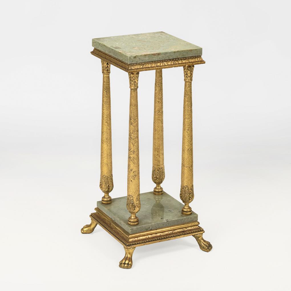 Stuckiertes, goldbronziertes Holz, gräulich-grüner Marmor. H ca. 66 cm, obere Platte: ca. 25 x 25 cm.