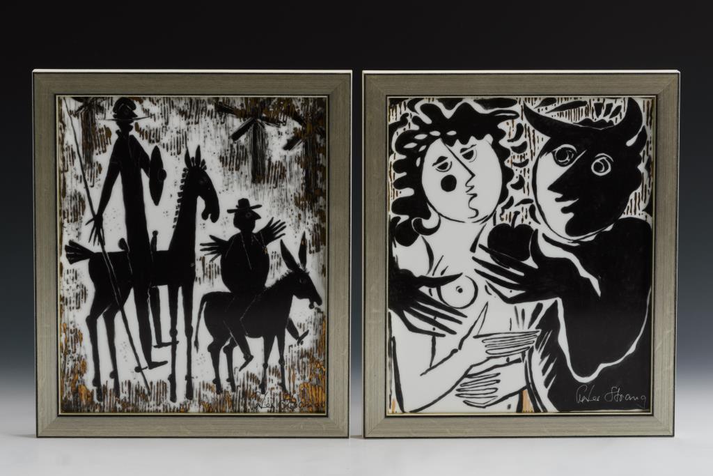 Rechteckige Platte, 1x mit der Darstellung einer nackten Frau, der ein Teufel ein Apfel reicht und 1x mit der Darstellung von Don Quijotte und Sancho Pansa.