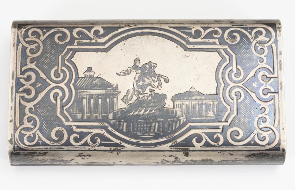 Zigaretten-Etui mit Rankendekor in Niello-Technik, verso Reiterdenkmal. Gebrauchsspuren, partiell etwas abgegriffen.