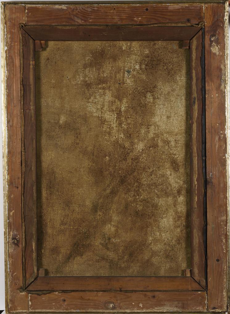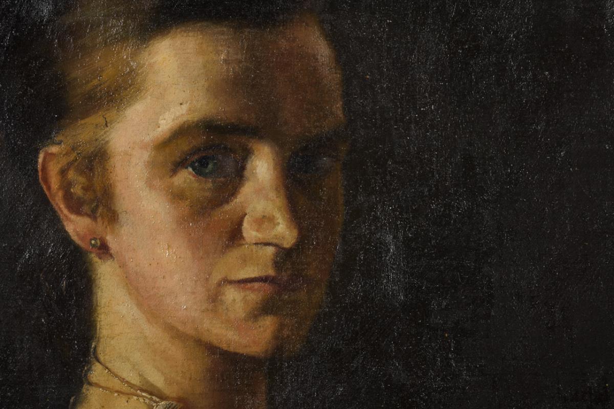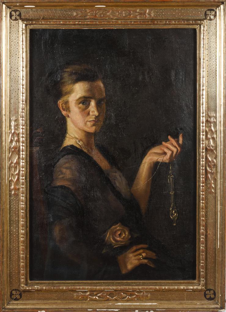 Selbstbewusst über die Schulter zum Betrachter blickende junge Frau, die demonstrativ den Gegenstand vorweist. Etwas gewellte Leinwand.