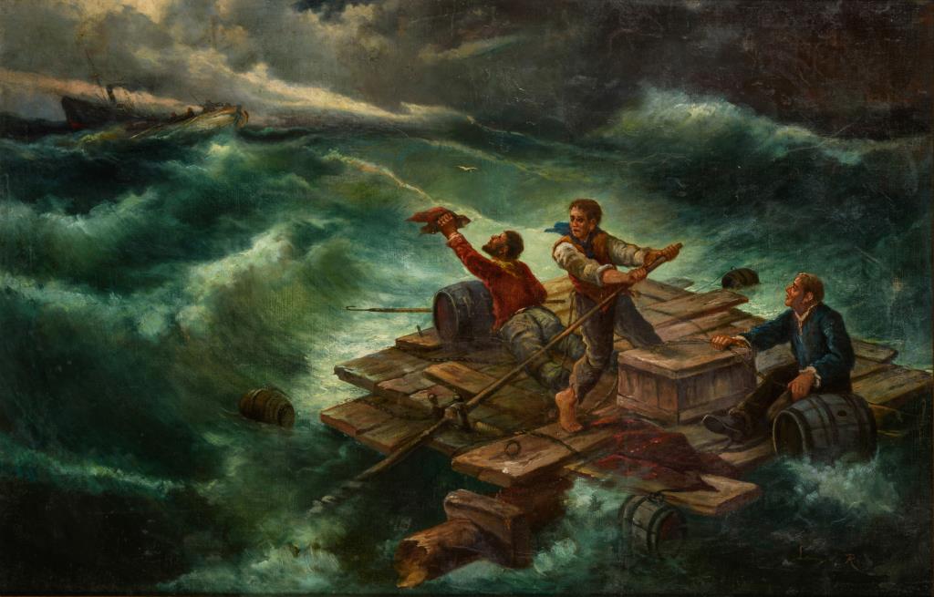 Schiffbrüchige bei starkem Wellengang mit nahender Rettung. Leinwand wachsdoubliert.
