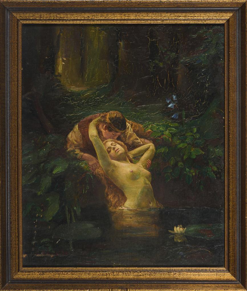 Ein Junge umfasst die sich zart aus dem Wasser räkelnde Nymphe. Leichte Kerben.