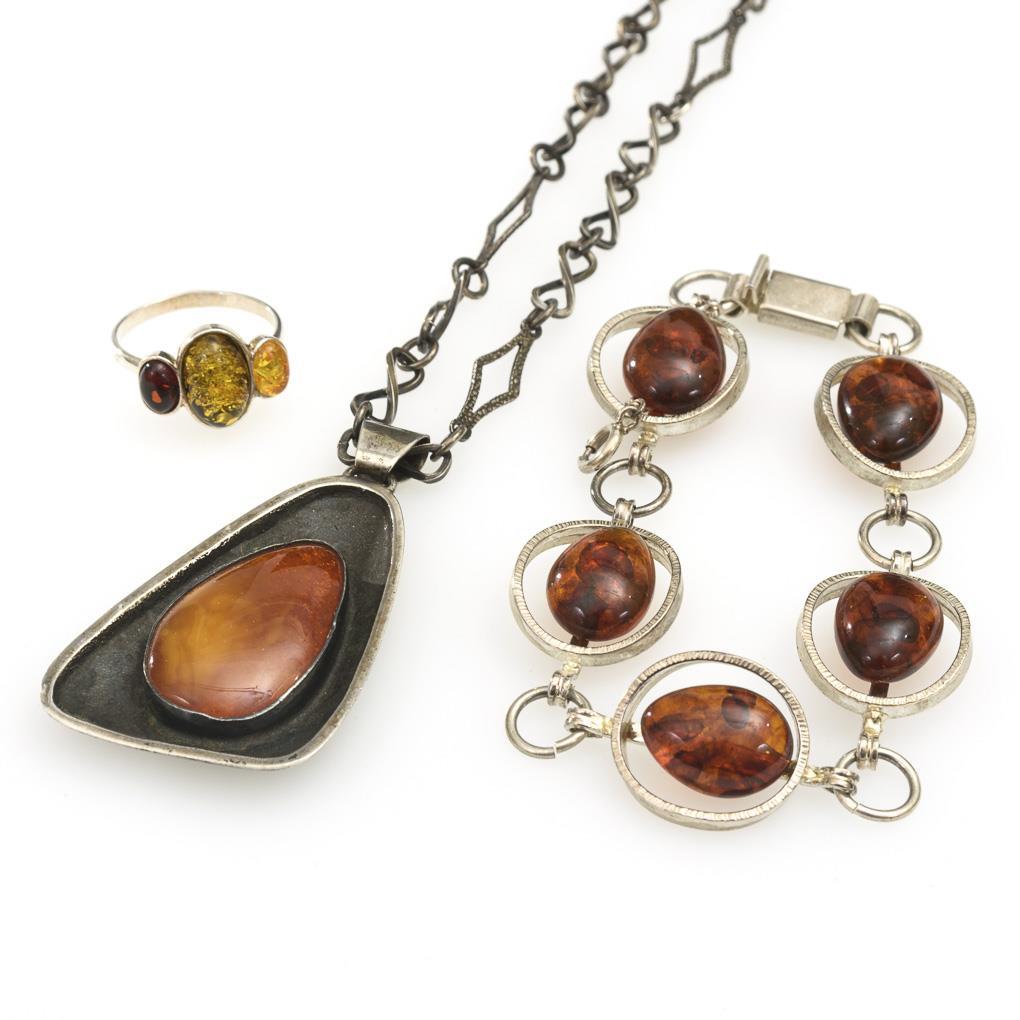 Anhänger, Armband und Ring mit Bernsteincabochons. Ziergliederkette mit Ringfederschließe. Kastenschloss mit Sicherheitskette. Schmale Schiene.