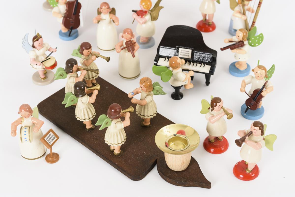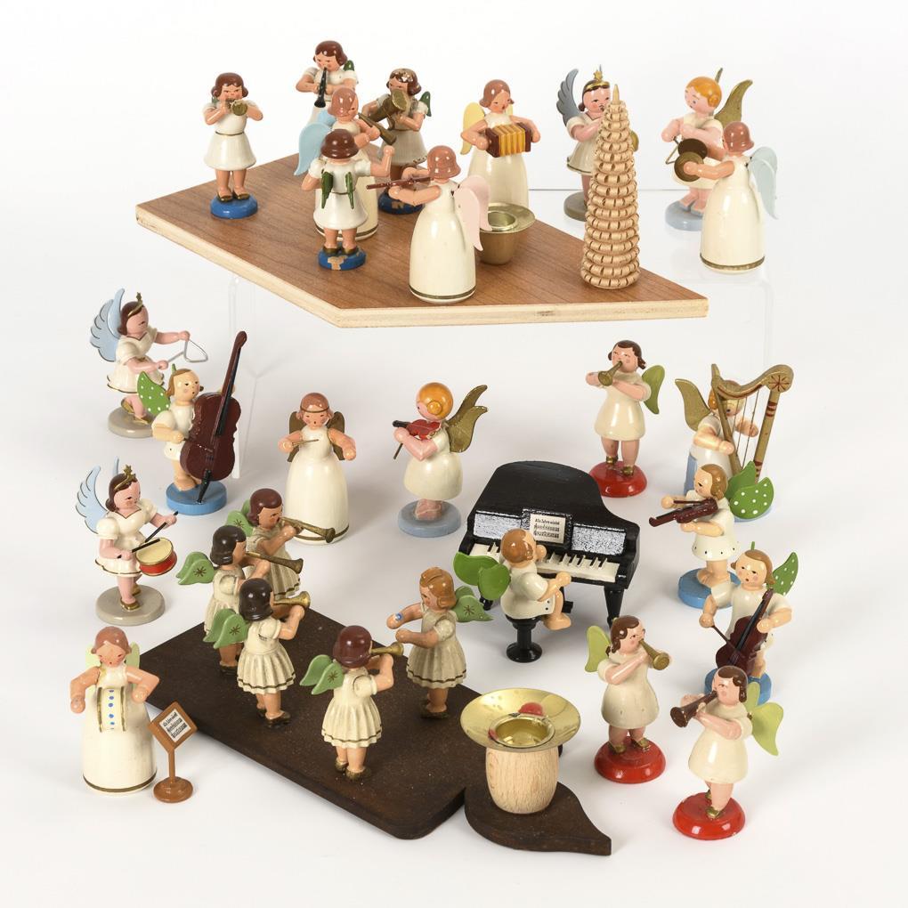 28 verschiedene Engel: 19x einzeln und 9x auf 2 Platten montiert. Darunter 1 schwarzer Flügel mit Pianistin. Einige mit Farbdefekten.