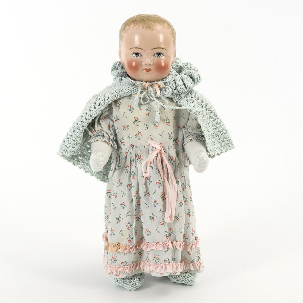 Nacktfrosch oder sogenannte "Frozen Charlotte" mit rosa getöntem Kopf, gemalten blauen Augen und modellierten blonden Haaren. Hellblaues Kleid mit Streublümchen und hellblaue Häkelkleidung. Glasurfehler unter den Füßen.