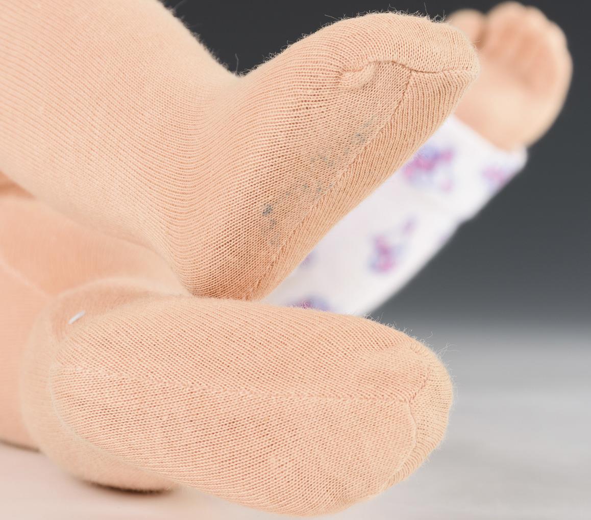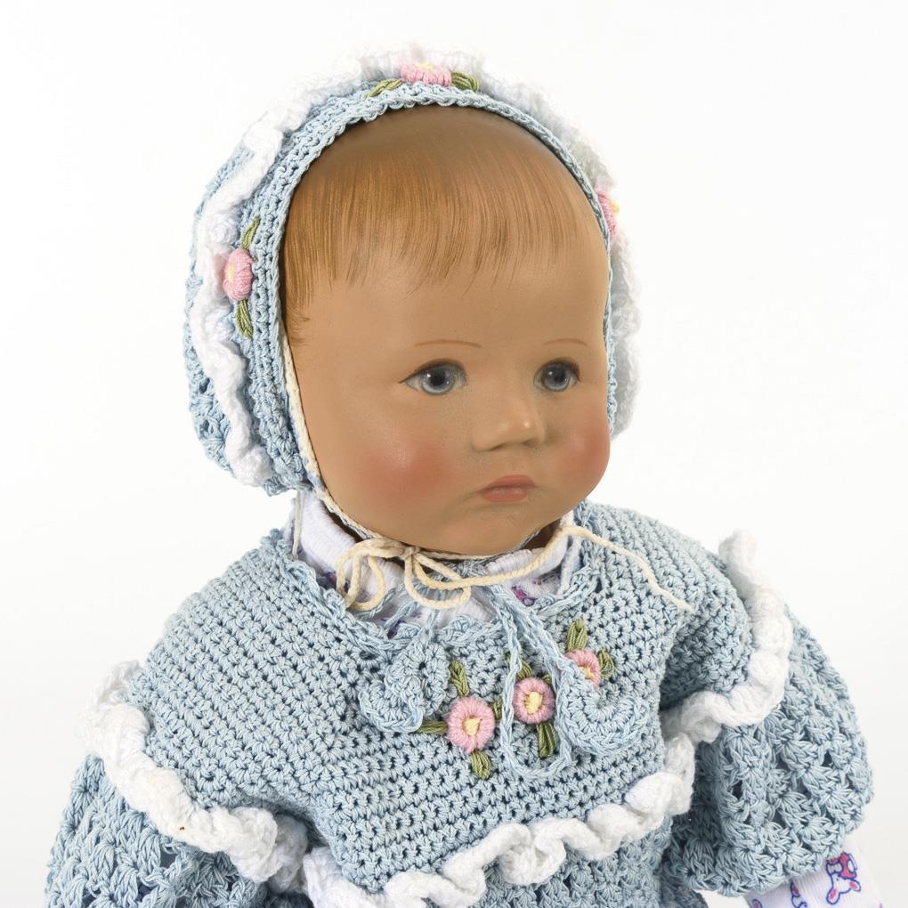Sogenanntes Sandbaby oder Lernbaby für Hebammen und Krankenschwestern. Beschwerte Ausführung mit geöffneten Augen, Nabel und Poloch. Hellblauer Strampler und gehäkelte Kleidung mit Mütze und Schuhen. Guter, wohl unbespielter Zustand.