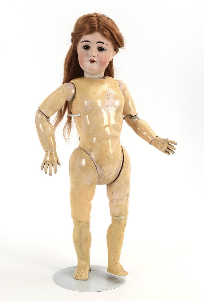 Kurbelkopf, nachgegipste braune Glasaugen, lange rote Kunsthaarperücke. 11-teiliger Gliederkörper in Toddler-Art. Zartes rosa Kleid, weißes Unterkleid, Strümpfe und schwarze Schuhe. Haarriss an der Stirn, Körper mit Altersspuren und kleinen Reparaturstellen.