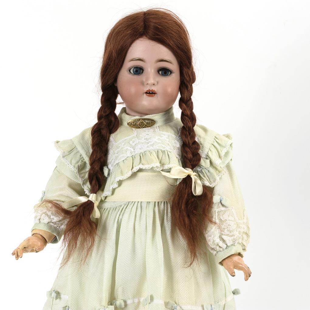 Kurbelkopf, blaue Schlafaugen, Wimpern, Ohrlöcher, rote Kunsthaarperücke mit Zöpfen. 17-teiliger Gliederkörper. Hellgrünes Kleid, weiße Strümpfe. Kopf durchleuchtet: ohne Defekte, lediglich brandrissig hinter den Ohren.