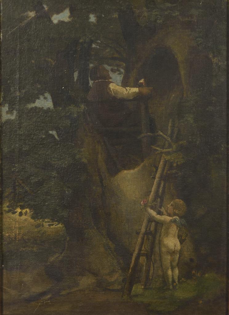 Der Putto mit Blume an einer Leiter mit Blick hinauf zu einem Mann auf einem Stuhl in einem Baumstumpf. Reinigungsbedürftig.