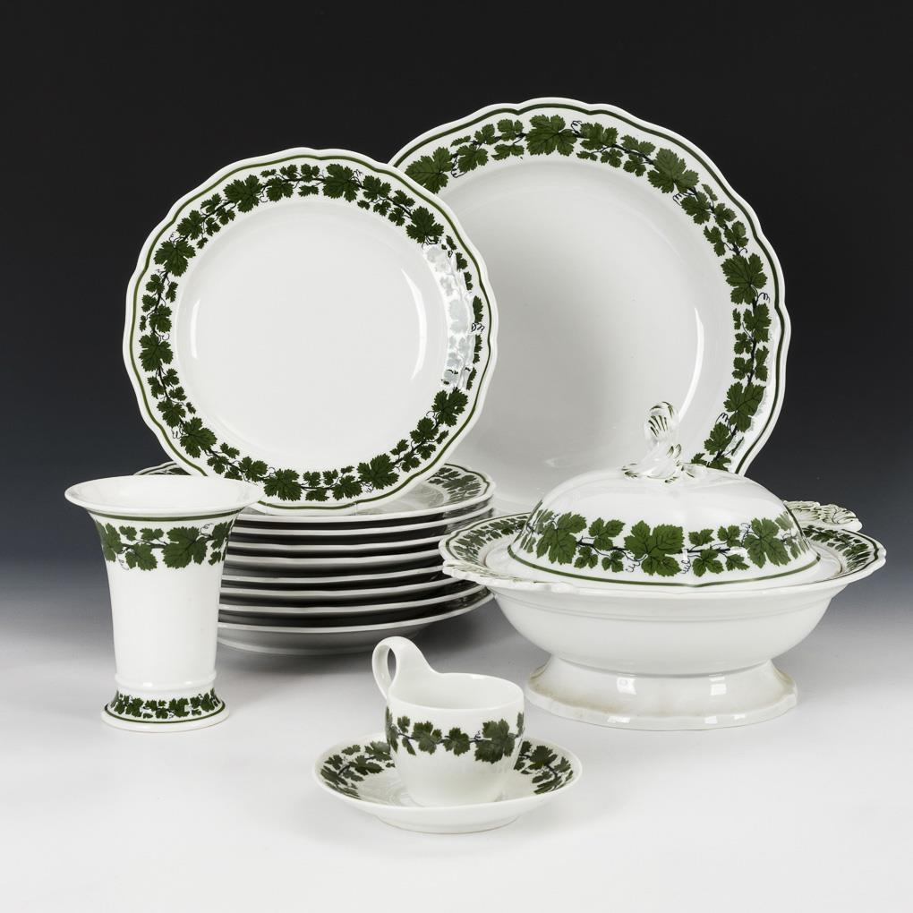 Form "Neuer Ausschnitt". 9 Speiseteller, 1 Gemüseteller (Ø 35,5 cm), 1 Deckelschüssel (H 17,5 cm), 1 Kratervase (H 13,5 cm) und 1 Campanertasse mit Untertasse. Bestoßung am Rand des Schüsseldeckels.