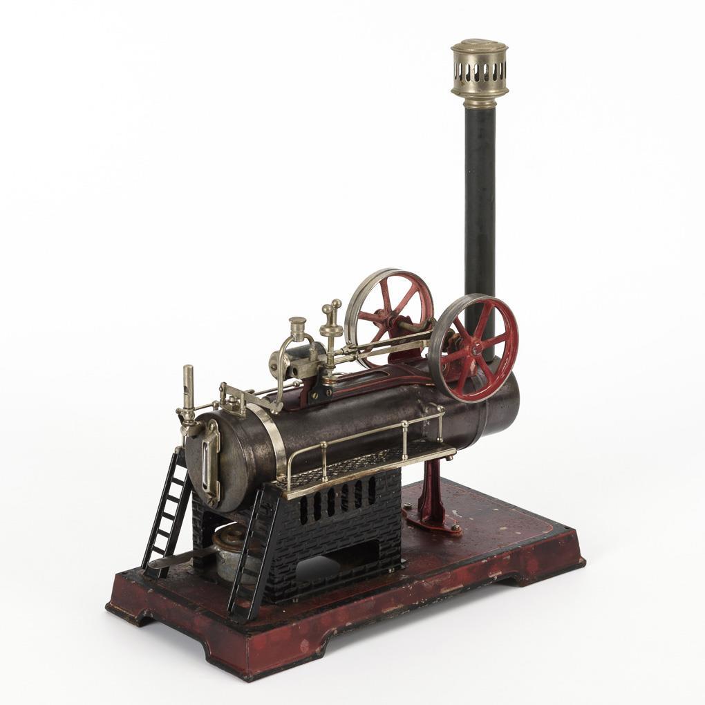 Stationäres Modell mit liegendem Kessel und feststehendem Zylinder. Alters- und Gebrauchsspuren. Funktion und Vollständigkeit nicht geprüft.