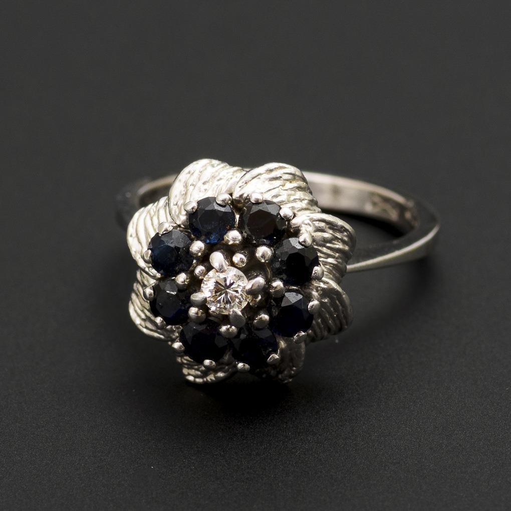 Kleiner Brillant, umringt von 8 Saphiren, zwischen schmaler Schiene.