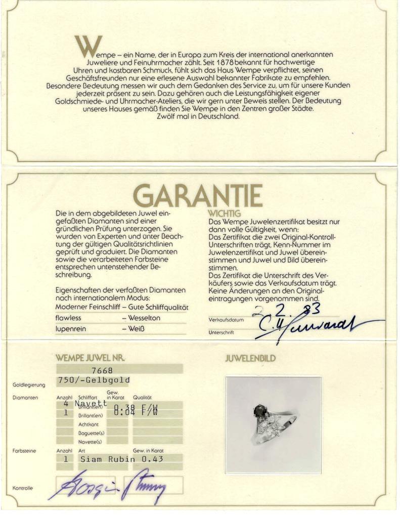 Wertermittlung laut vorliegendem Gutachten von 2015: 4.580,00 Euro. Juwelen-Zertifikat WEMPE von 1983.