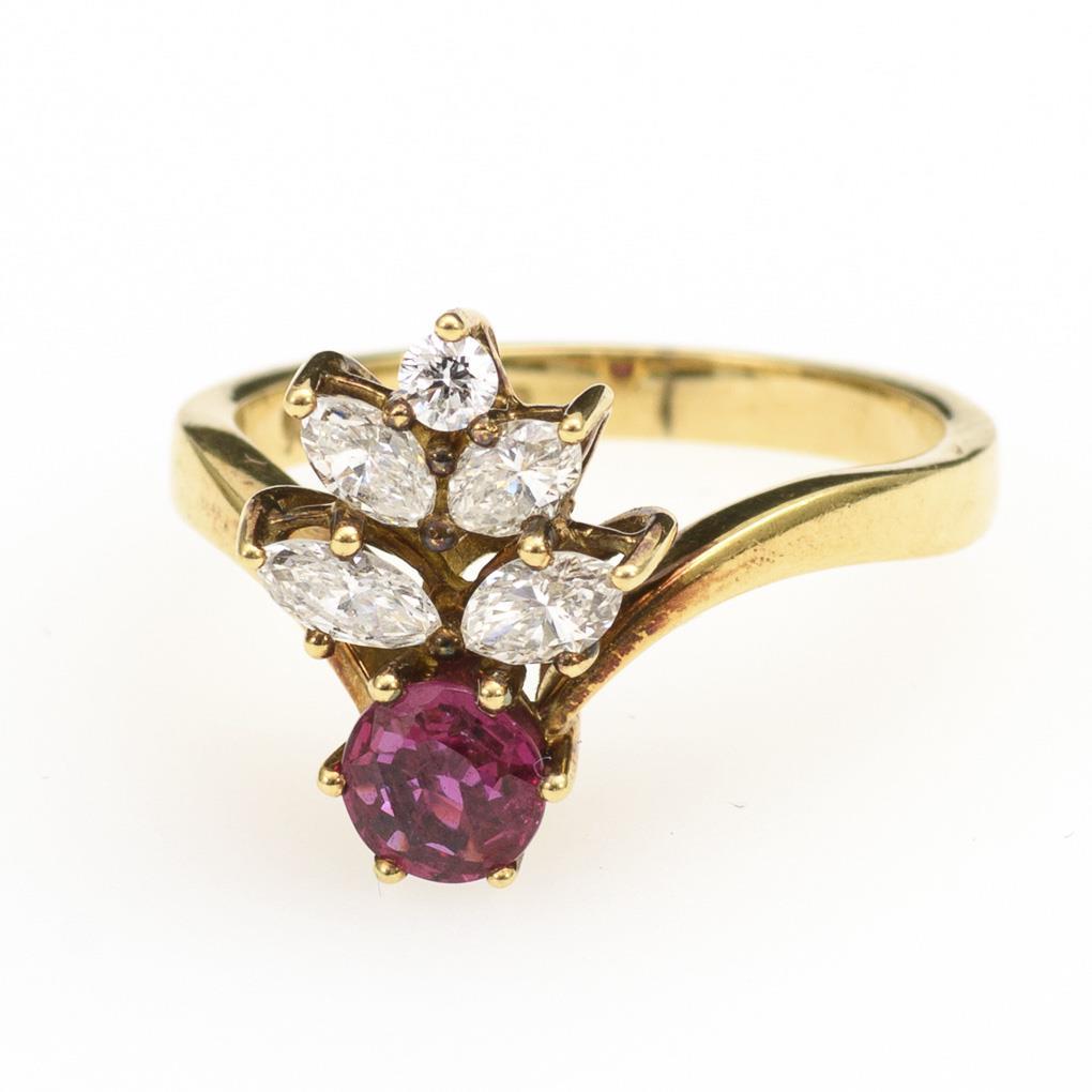 Gelbgold 750 gestempelt. Punze: WEMPE. Ringgröße 50. Siam-Rubin ca. 0,43 ct/Brillant ca. 0,04 ct/Diamanten gesamt ca. 0,38/Weiß/lr. 3,7 g.