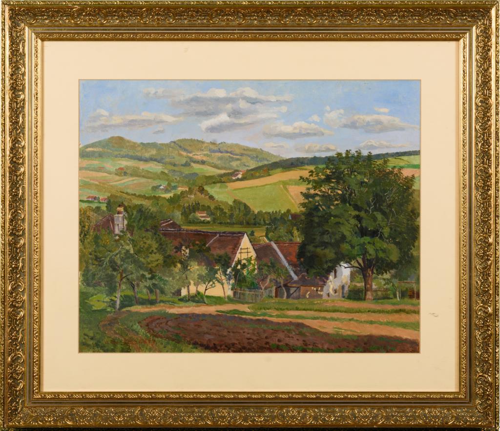 Hügelige Dorflandschaft mit Häusern und Felsen im Sonnenschein. Leichte Altersspuren.