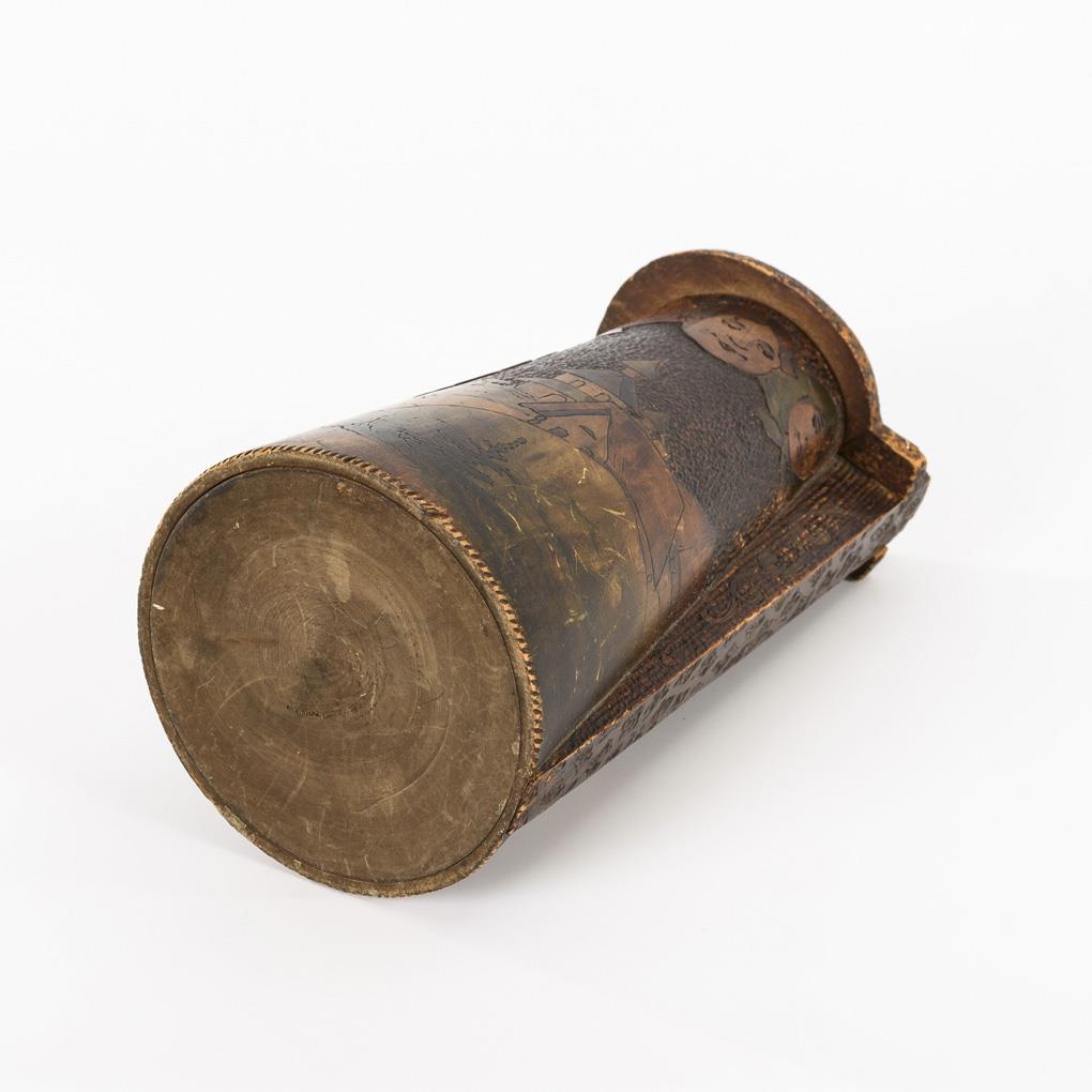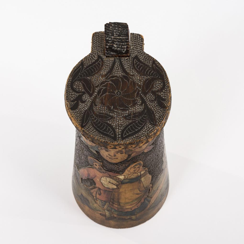 Konischer Krug mit Scharnierdeckel. Auf der Wandung Liebespaar vor dem Dorf mit Kirche sowie Gesichter in reliefartiger Konturschnitzerei. Einige Alters-/Gebrauchsspuren.