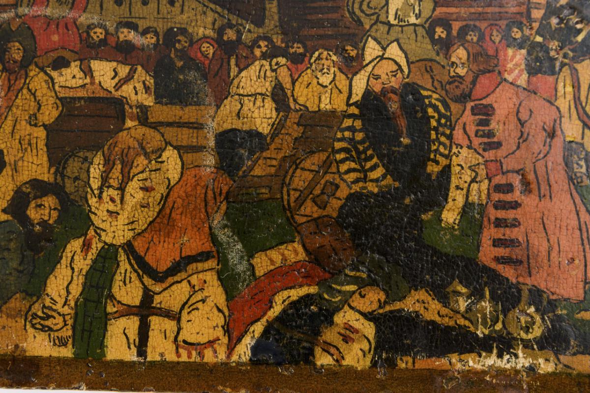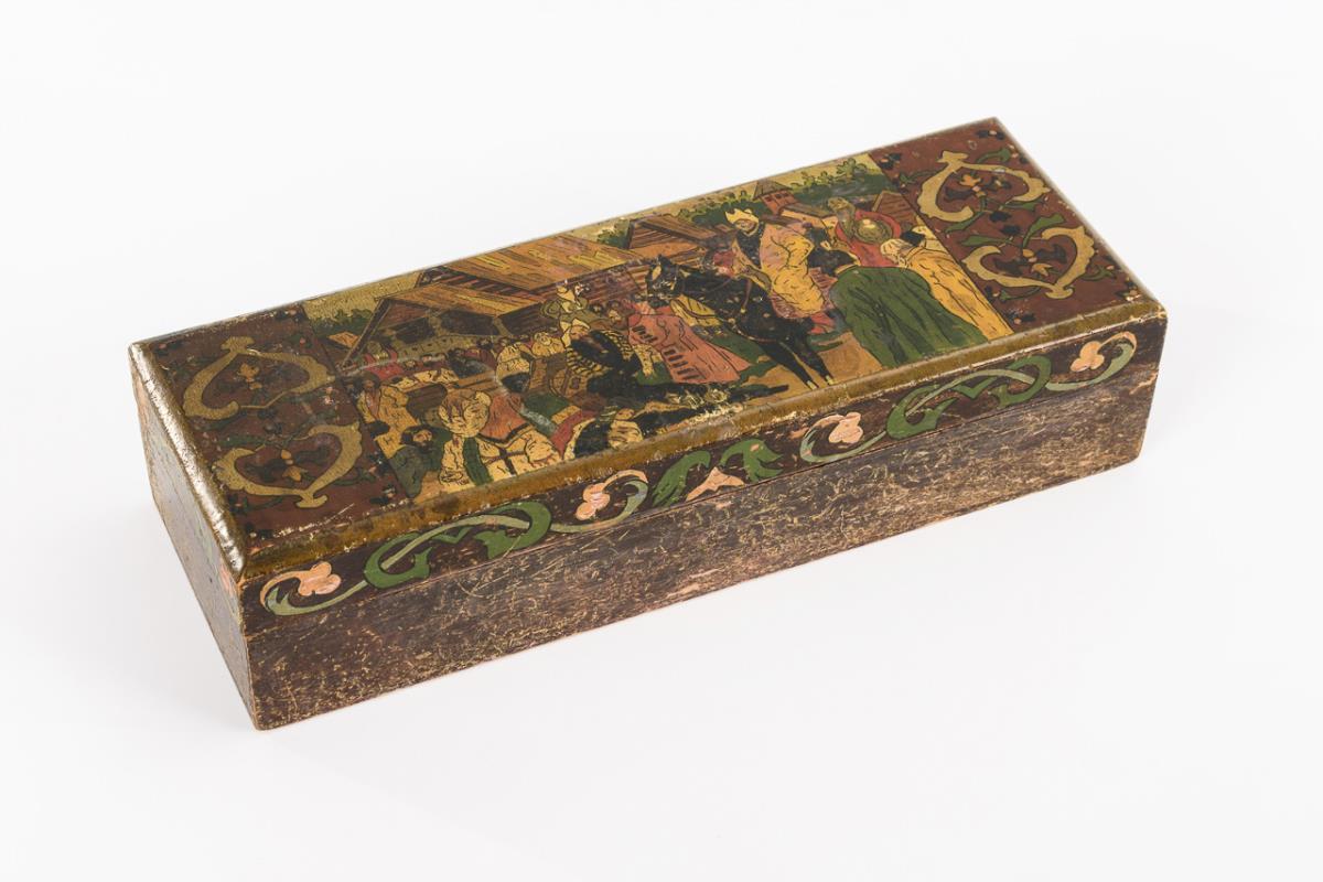 Oblonge Schatulle; auf dem Scharnierdeckel vielfigurige Märchenszene nach Ivan Bilibin. Starke Alters-/Gebrauchsspuren.