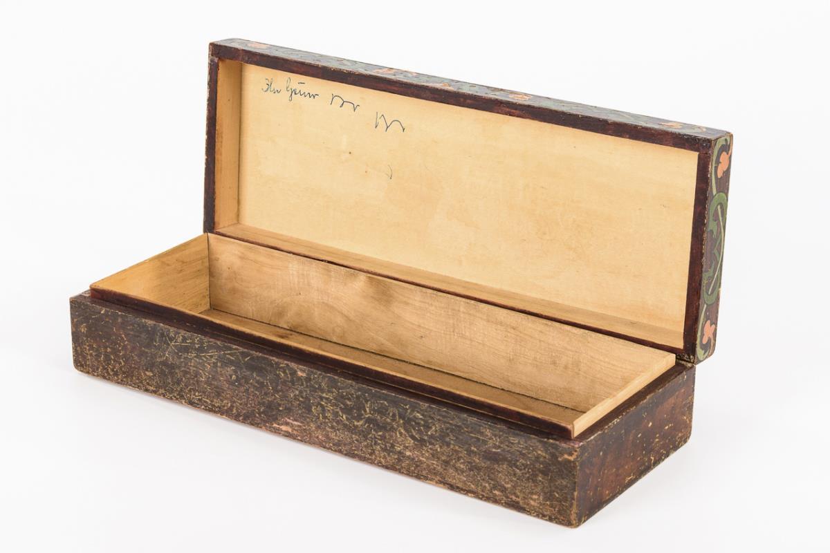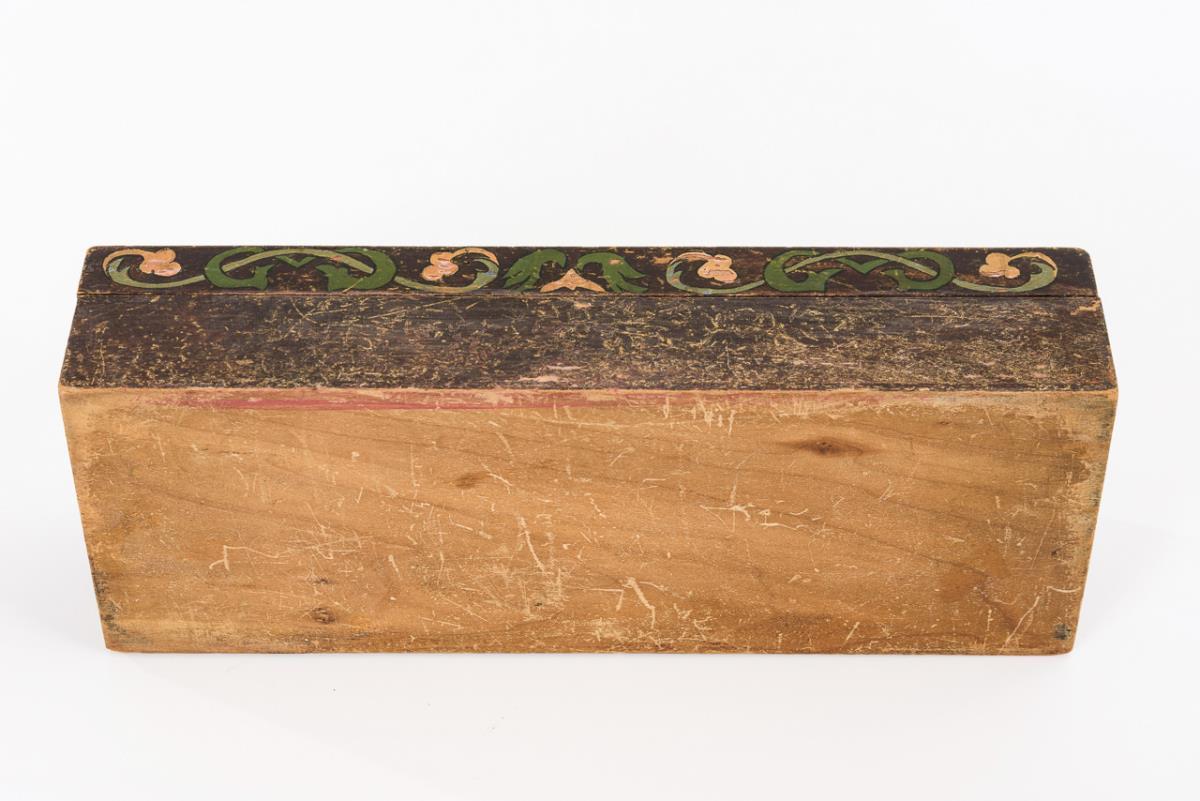 Ahorn(?) polychrom bemalt. 7 x 31 x 11,5 cm.