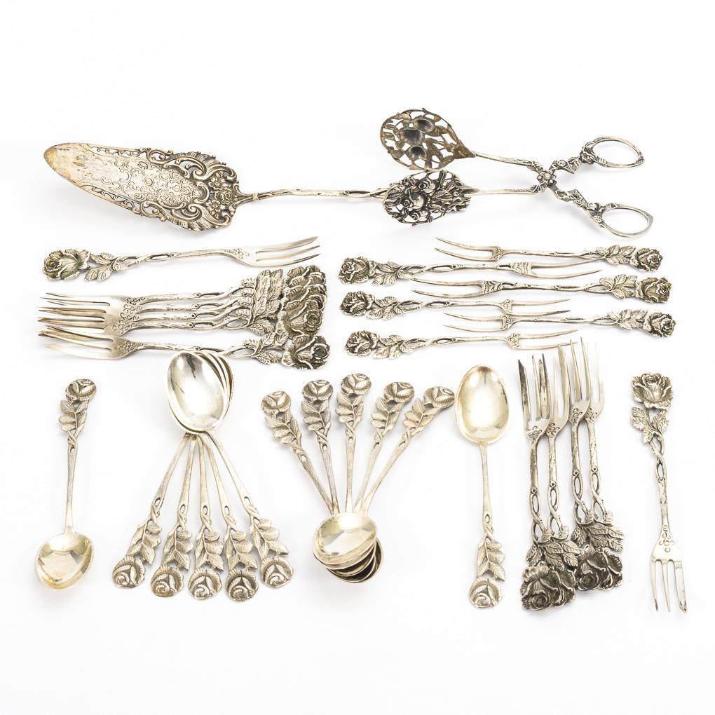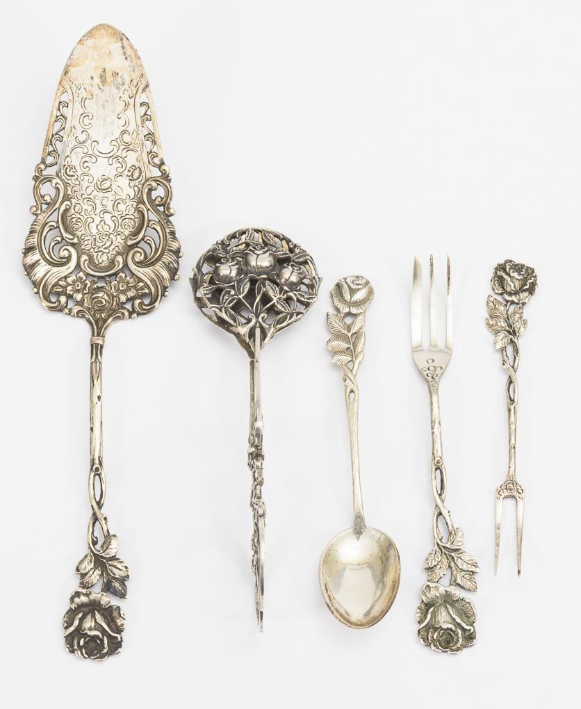 12 Löffel in blauem Etui, 3 Vorlegeteile (Tortenheber, Gebäckzange, Zuckerzange), 6 Spieße, 11 Kuchengabeln. Partiell durchbrochen gearbeitet, reliefierter Rosendekor.
