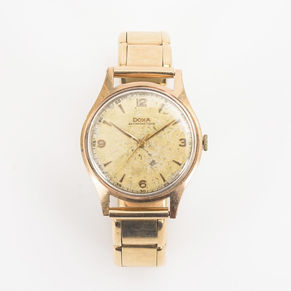Werk mit Ankerhemmung und Kronenaufzug, läuft. Goldfarbenes Zifferblatt mit arabischen Zahlen, Minutenkranz, Blattzeigern und Zentralsekunde, bezeichnet "Doxa, Antimagnetique".