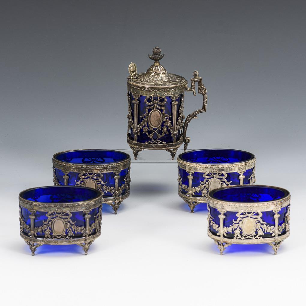 5 ovale Schälchen und 1 Henkelgefäß mit Löffelchen im Empire-Stil mit Rosenfestons und Schleifenzier, herausnehmbare Einsätze aus Kobaltglas. 2 Gläser mit minimalen Randchips, leichte Alters- und Gebrauchsspuren.