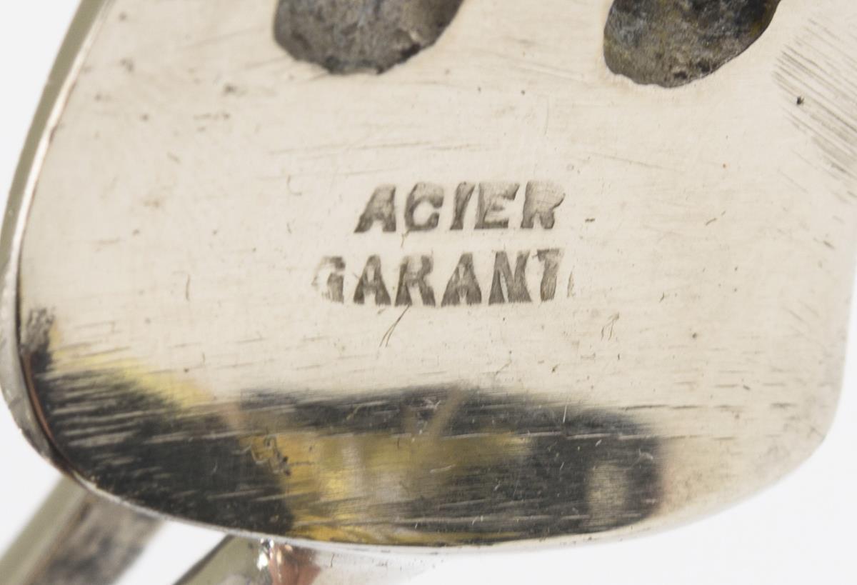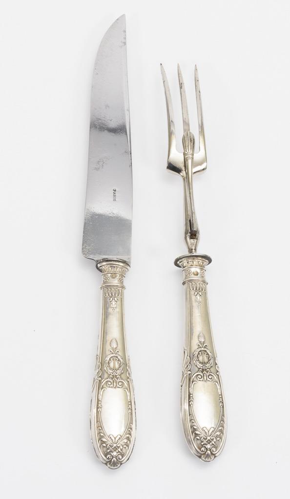 Gabel und Messer mit historistisch verzierten Silberreliefgriffen im Louis-Seize-Stil. Klinge und Zinken aus Stahl. Minimale Gebrauchsspuren.