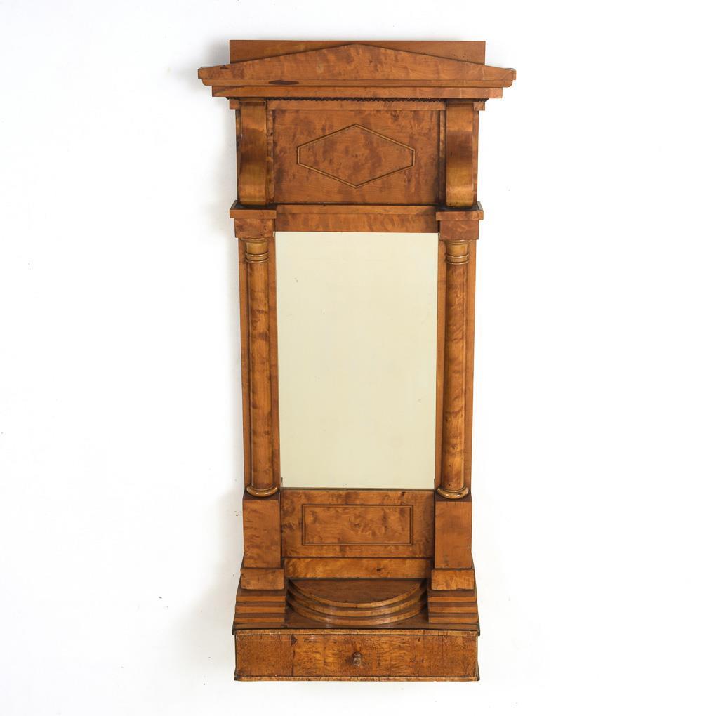 Architektonisch gestalteter Wandspiegel mit kassettiertem Gesims und Dreiecksgiebel, flankiert von plastischen Voluten und Halbsäulen, auf getrepptem Sockel mit Schub. Alt restauriert, Alters-/Gebrauchsspuren.