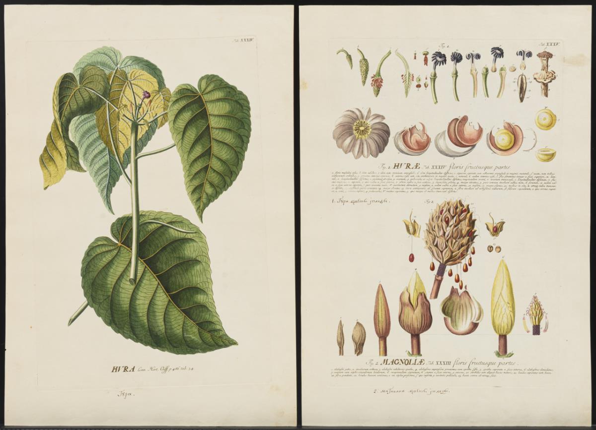 Tafel XXXIV "Hvra Linn. Hort. Cliff. P.486. tab.34" | Tafel XXXV "Fig. 1. Hvrae floris fructusque partes"und "Magnoliae Tab. XXXIII floris fructusque partes" (auf einem Blatt) mit Tuschbezeichnung in Griechisch von alter Hand, gestochen von Johannes Jacob Haid; aus Christoph Jacob Trews "Plantae selectae quarum imagines ad exemplaria naturalia Londini, in hortis curiosorum nutrita", 1750 - 1773. Je etwas fleckig und griffspurig.
