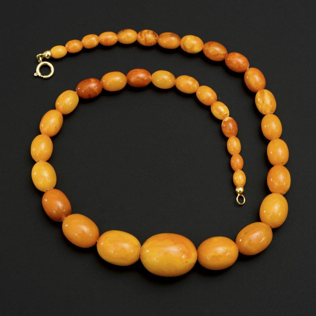 Schnürkette mit Bernsteinoliven im Verlauf, an Ringfederschließe.