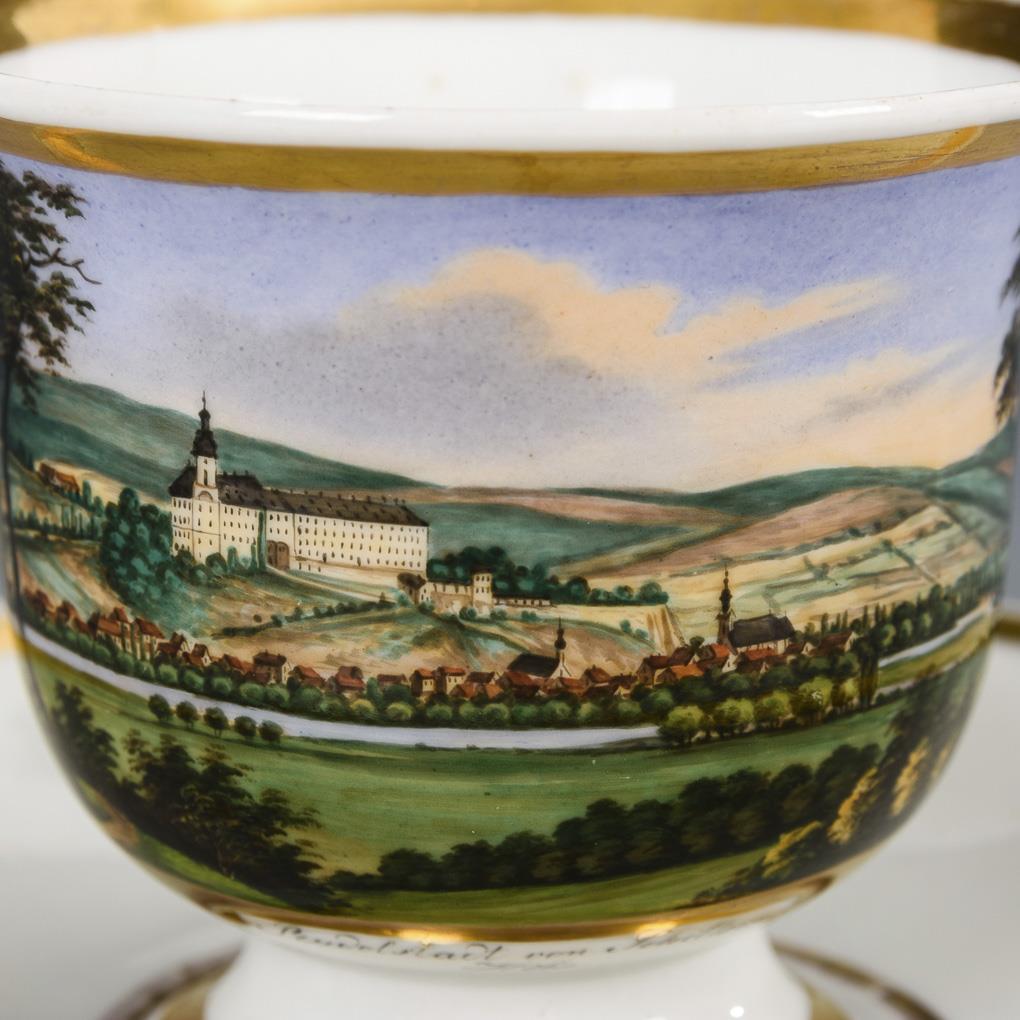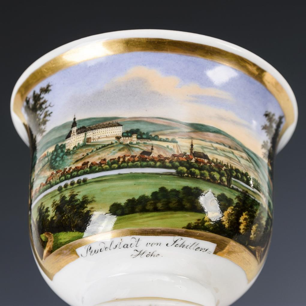 Gefußte Glockentasse mit spitz geschweiftem Henkel. Schauseitig eine goldgerahmte Rechteckkartusche mit der Ansicht der Stadt Rudolstadt mit Blick auf die Heidecksburg, bezeichnet "Rudolstadt von Schillers-Höhe". Minimaler Goldabrieb.