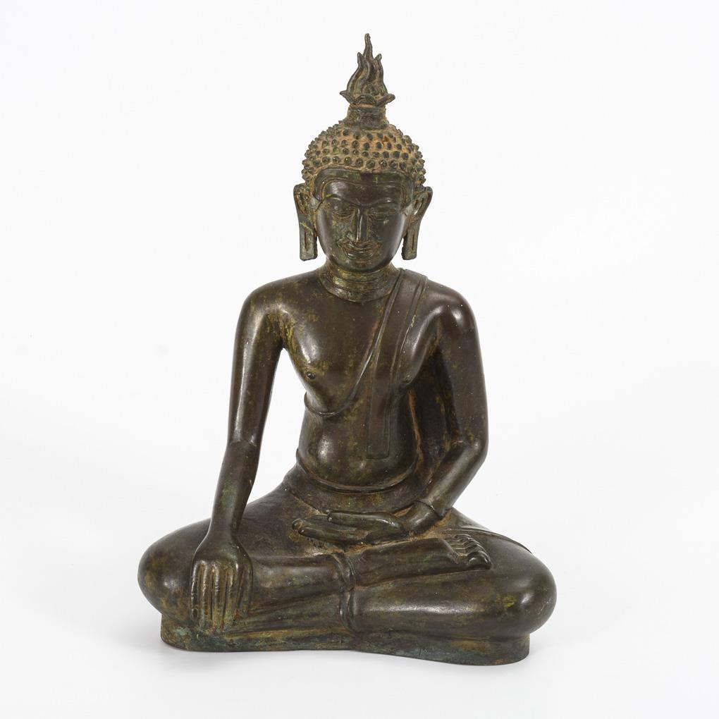 Schlichte Figur im Verschränkungssitz mit der Geste der Erdberührung. Sockel unten offen.