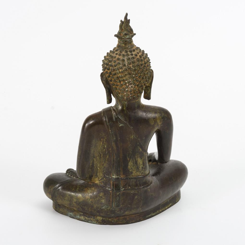 Schlichte Figur im Verschränkungssitz mit der Geste der Erdberührung. Sockel unten offen.