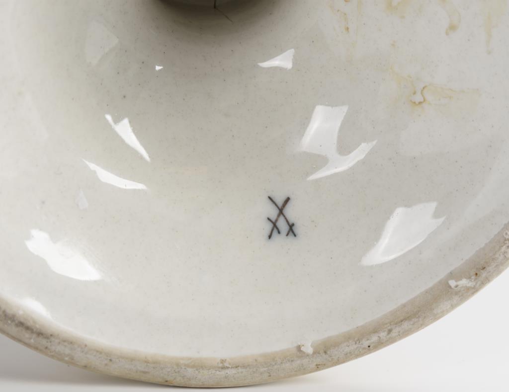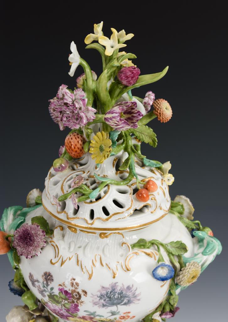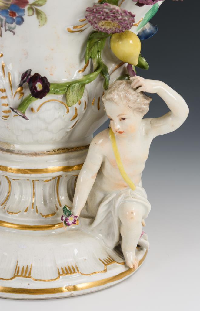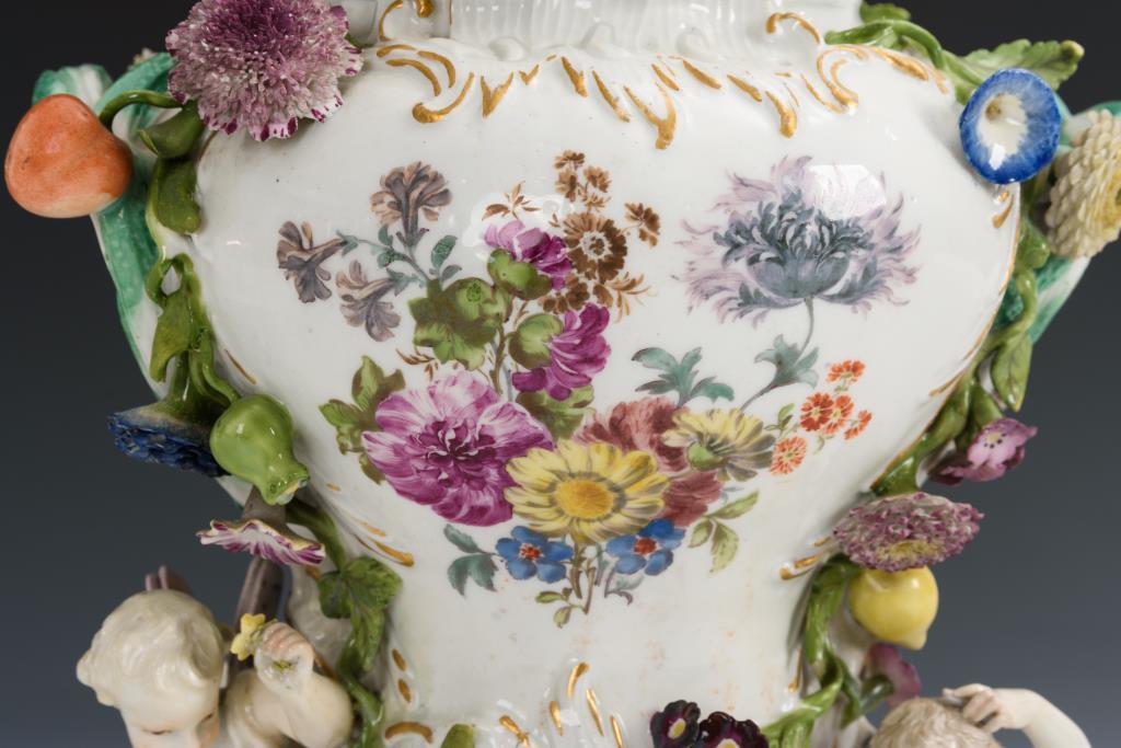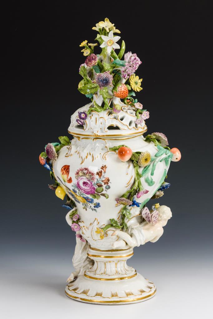 Balustervase mit Rocaillerelief, reichem Blüten- und Fruchtbelag sowie durchbrochen gearbeitetem Deckel mit einem Blumen- und Fruchtbukett als Bekrönung, an der Vase zwei Putten sitzend. Bestoßungen und Restaurierungen am Belag, 1x Puttenflügel restauriert, kleiner Brandriss am Mündungsrand.