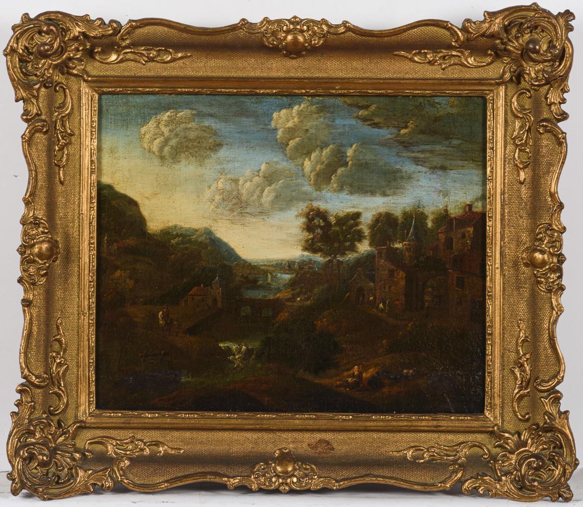 Barocker Maler: Landschaft mit Stadt und Staffage