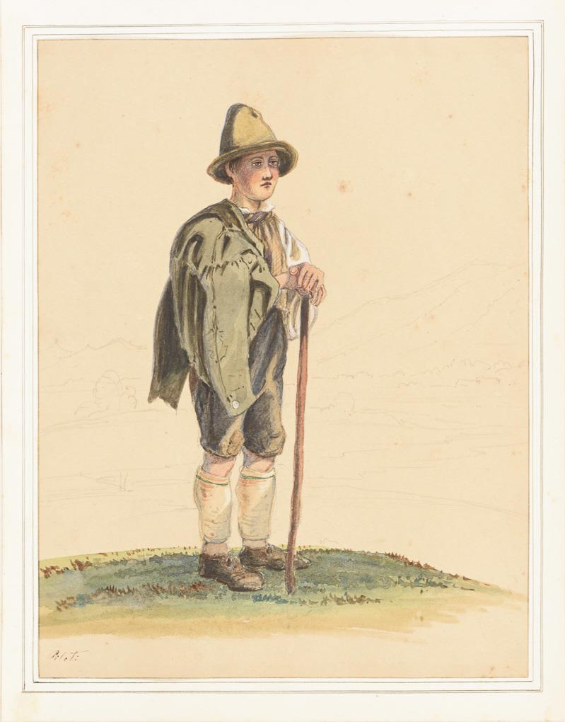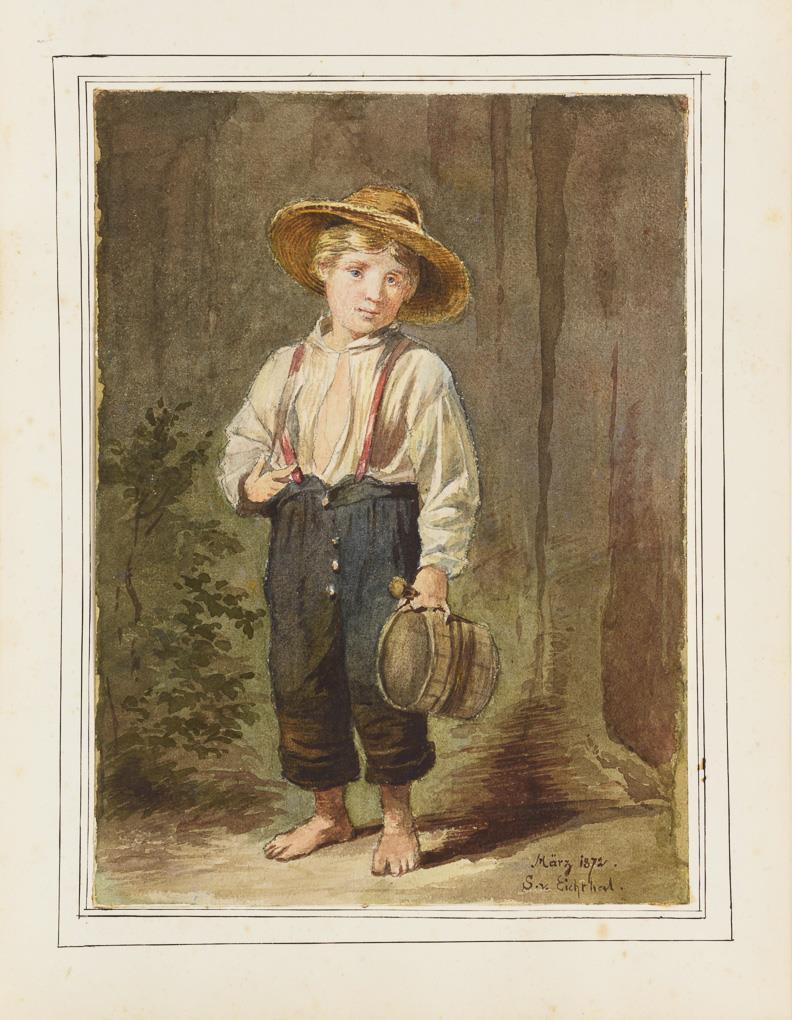 Junger Hirtenknabe in alpenländischer Kleidung in bergigem Land sowie kleiner Junge mit Eimer und Sommerhut. Leichte Altersspuren.