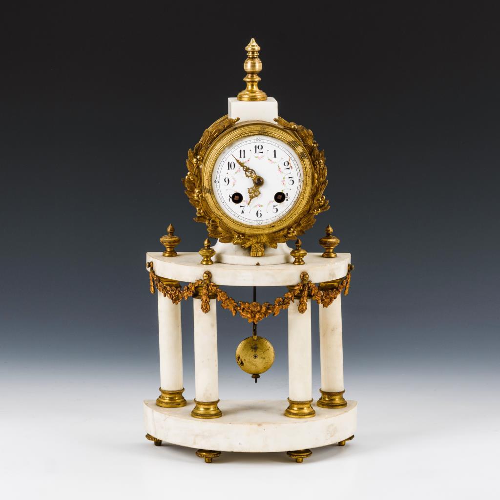 Weißer Marmor, Messing. Demi-Lune-Portaluhr mit 4 Säulen, Festons und Vasenbekrönung. Werk überholungsbedürftig, läuft an.Kantenbestoßungen, Zifferblattdefekte, Glasdeckel fehlt, Altersspuren.