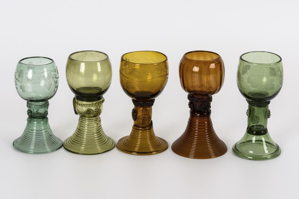 Verschiedene Römer, darunter 1x mit längsoptisch formgeblasener Kuppa und 3x mit gravierten Weinreben auf der Kuppa, Hohlschaft mit aufgeschmolzenen Beerennuppen und Zwackelband, 1x glatter und 4x gerillter Trompetenfuß. 1x kleine Bestoßung am Fußrand.