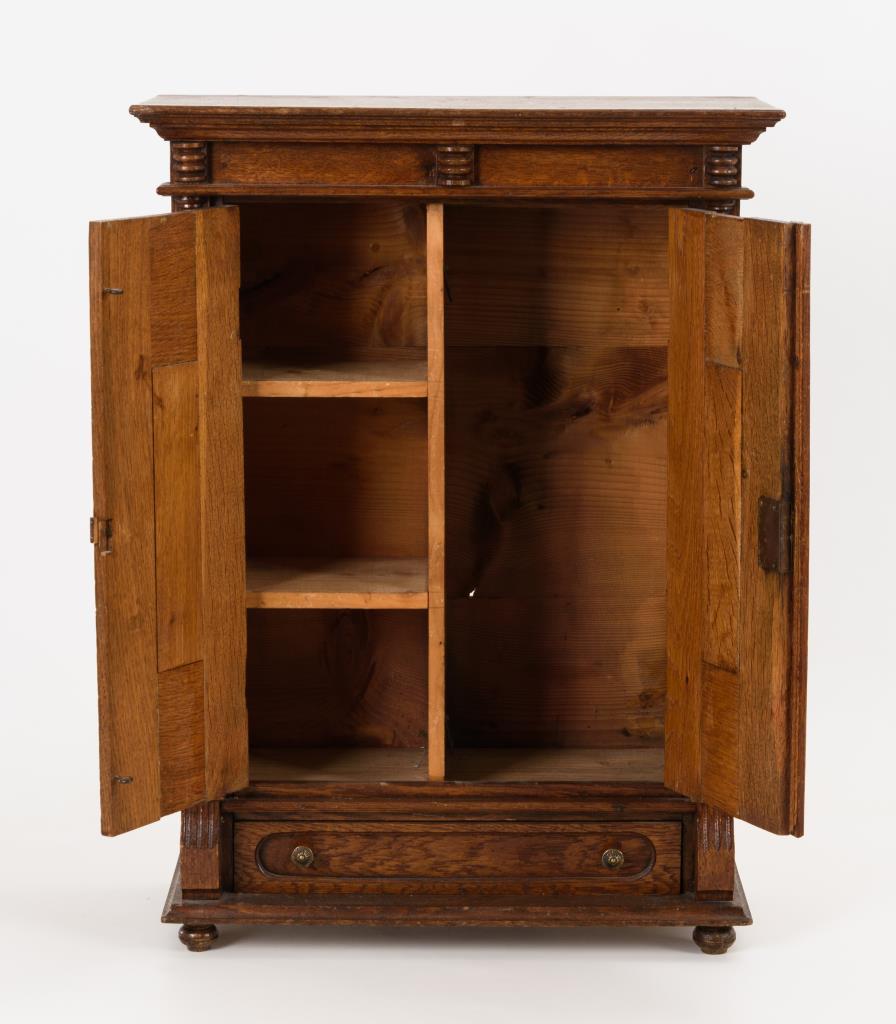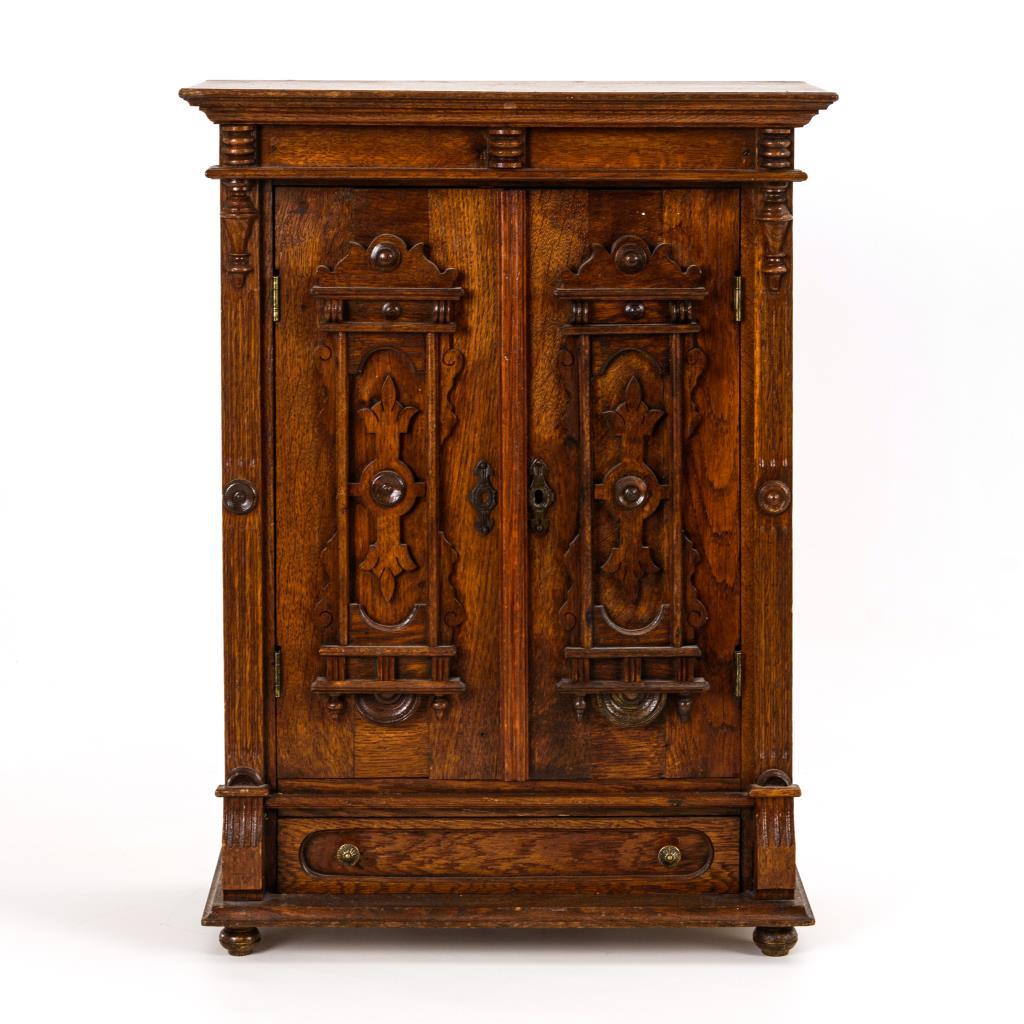 2-türiges Schränkchen mit 1 Sockelschub. Front mit aufgelegten Verzierungen. Auch als Puppenschrank verwendbar. Ohne Bekrönung und Schlüssel.