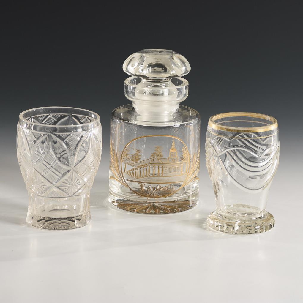 1x zylindrische Karaffe mit einer schauseitigen, goldstaffierten Ansicht von Landeck/Schlesien (Stopfen ergänzt; H 15,5 cm). / 2x verschiedene Becher mit Kerb-, Steinel- und Flächenschliffdekor. Gold berieben.