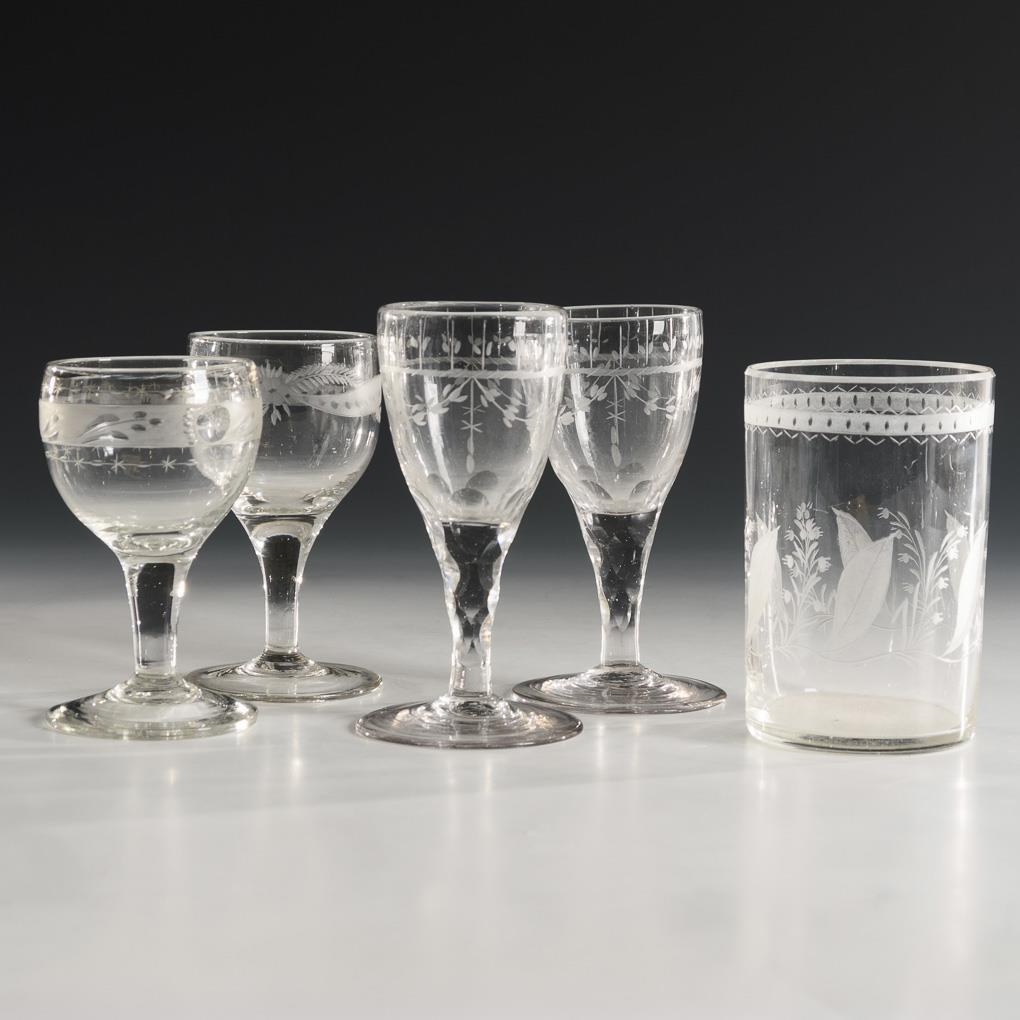 1x Zylinderbecher mit Floraldekor. / 2 verschiedene Kelchgläser mit bauchiger Kuppa und floral-ornamentalem Dekor. / 2 Kelchgläser mit ovoider, in den wabenfacettierten Schaft übergehender Kuppa, Rundfuß; auf der Kuppa eine stilisierte Blumenbordüre und Blattfestons. Rand des Zylinderglases minimal bestoßen.
