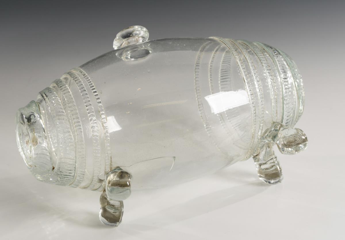 Vierkantflasche mit Kerb- und Olivenschliff (H 23 cm), Karaffe mit reicher ornamentaler Gravur (H 21,5 cm) und Branntweinfässchen mit aufgelegten Zwackelbändern und vier Füßen. Spannungsriss im Boden des Branntweinfässchens und im Henkel der Karaffe.